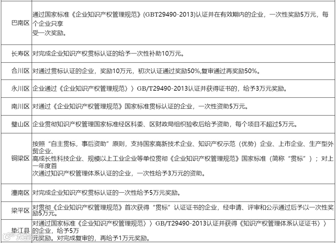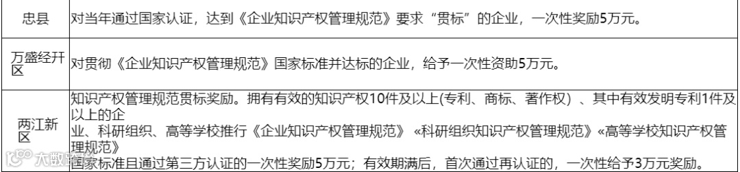 贯标奖励100000元,重庆市知识产权贯标奖励政策汇总!