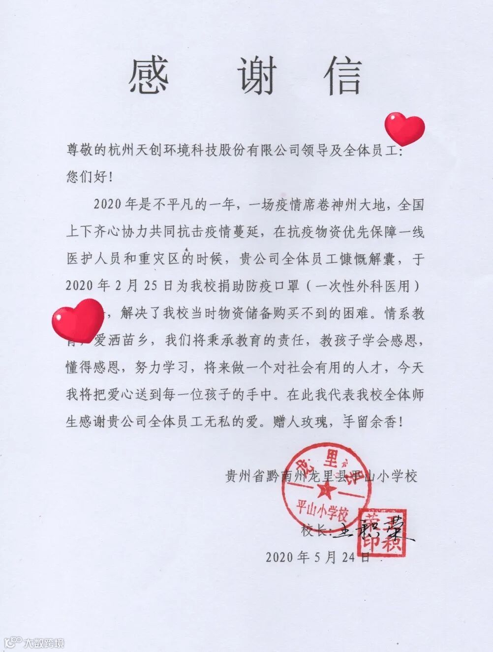 儿童是国家的未来,是民族的希望,给所有儿童创造良好的家庭、社会和学习环境,让他们健康、快乐、幸福地成长,一直是全社会努力的目标。天创也一直在用行动去关爱困境中的儿童!今年年初突如其来的疫情,让口罩成为了稀缺物资。在贵州省黔南州龙里县平山小学出现物资储备不够、无法购买到口罩的情况下,天创全体员工为学校筹集、捐助了上百只口罩,给小学的孩子送去了关爱。这些年,天创没有停下帮扶的步伐,勇于承担起企业的社会责任,不忘初心、砥砺前行!