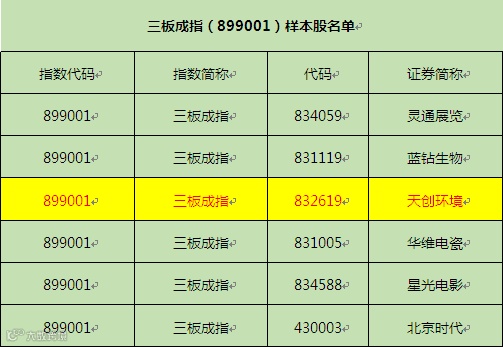 3月8日,全国中小企业股份转让系统有限责任公司及中证指数有限公司联合发布了实施创新层分层前的最后一次三板成指(899001)和三板做市(899002)样本股的调整结果,于3月14日生效。环保+医疗概念新型高新技术企业天创环境(股票代码:832619)入选三板成指样本股。