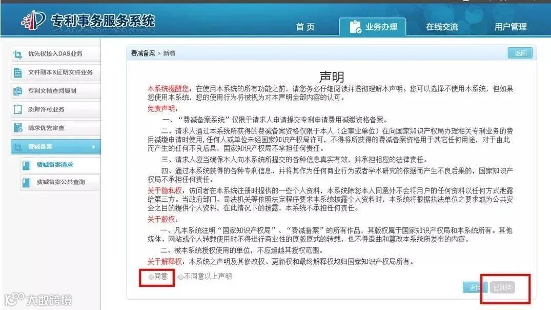 3.进入声明页面,选择“同意”,点击“已阅读”按钮,进入新增费减备案申请页面。