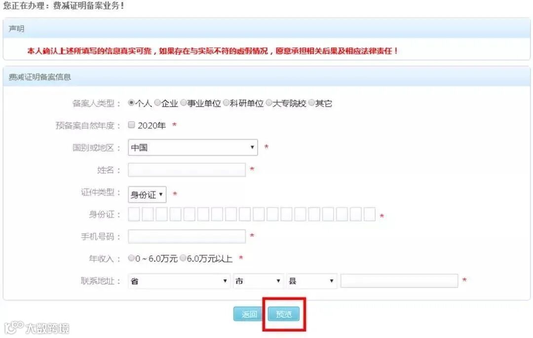 4.根据实际情况填写信息,有红色星号*的为必填项,填写完成后点击“预览”按钮,进入预览页面。