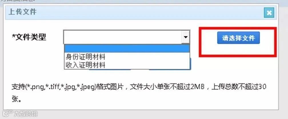 点击“附件信息”处的“上传文件”,在弹出的对话框中选择“文件类型”,点击“请选择文件”,在弹出的对话框中添加相应的图片文件。