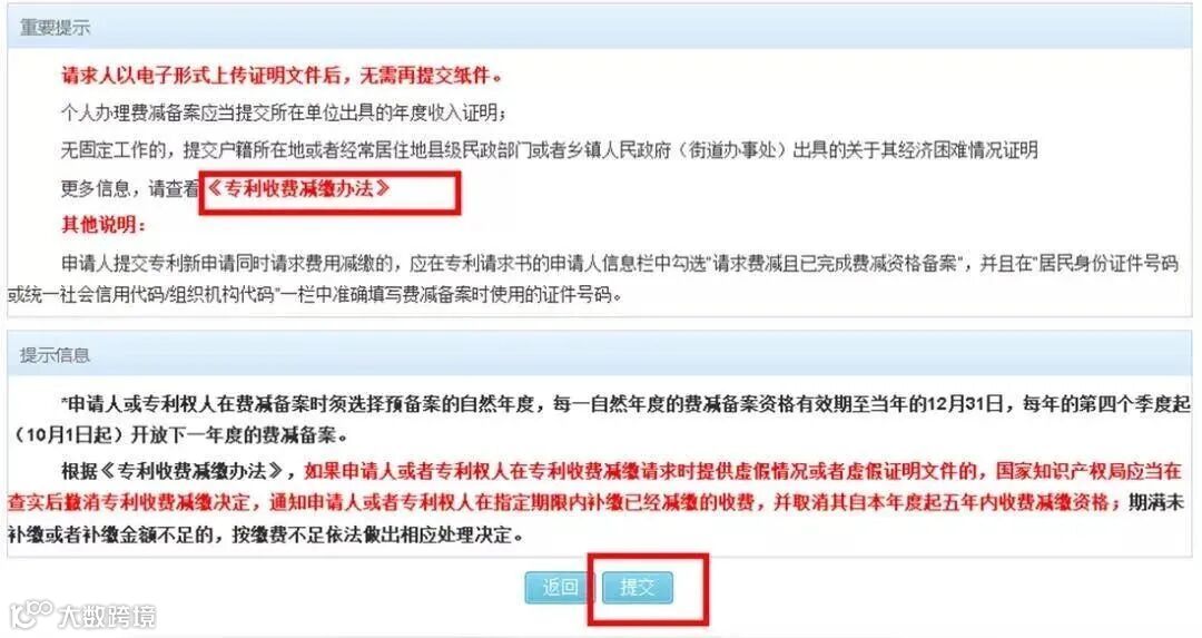 6.页面展示出费减备案享受的权利以及重要提示,此页信息提交成功后可以在查看页面打印,点击“提交”。