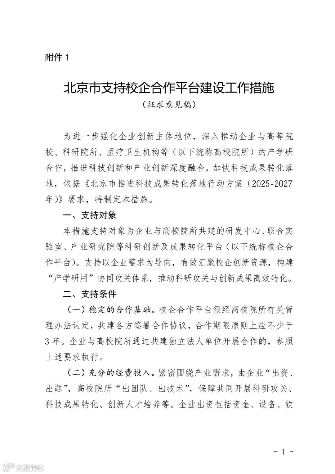附件:1.《北京市支持校企合作平台建设工作措施(征求意见稿)》