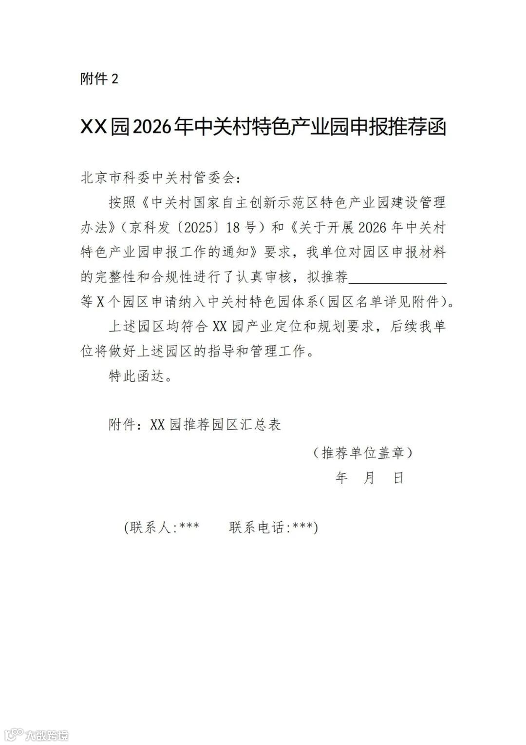 (二)各分园管理机构对申报材料进行审核,并出具加盖公章的推荐函(附件2),于2026年2月3日前以分园为单位向市科委中关村管委会报送分园推荐函和项目申报材料,纸质版送至北京市海淀区阜成路73号裕惠大厦C座812,电子版材料发送至Ldu@kw.beijing.gov.cn,联系人:杨老师,联系电话:010-88828805。