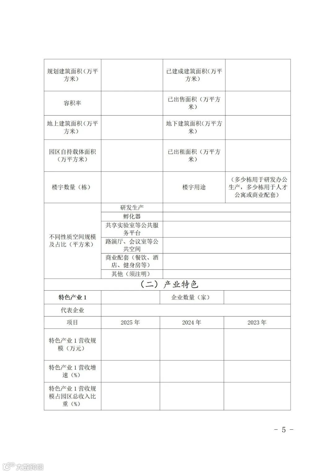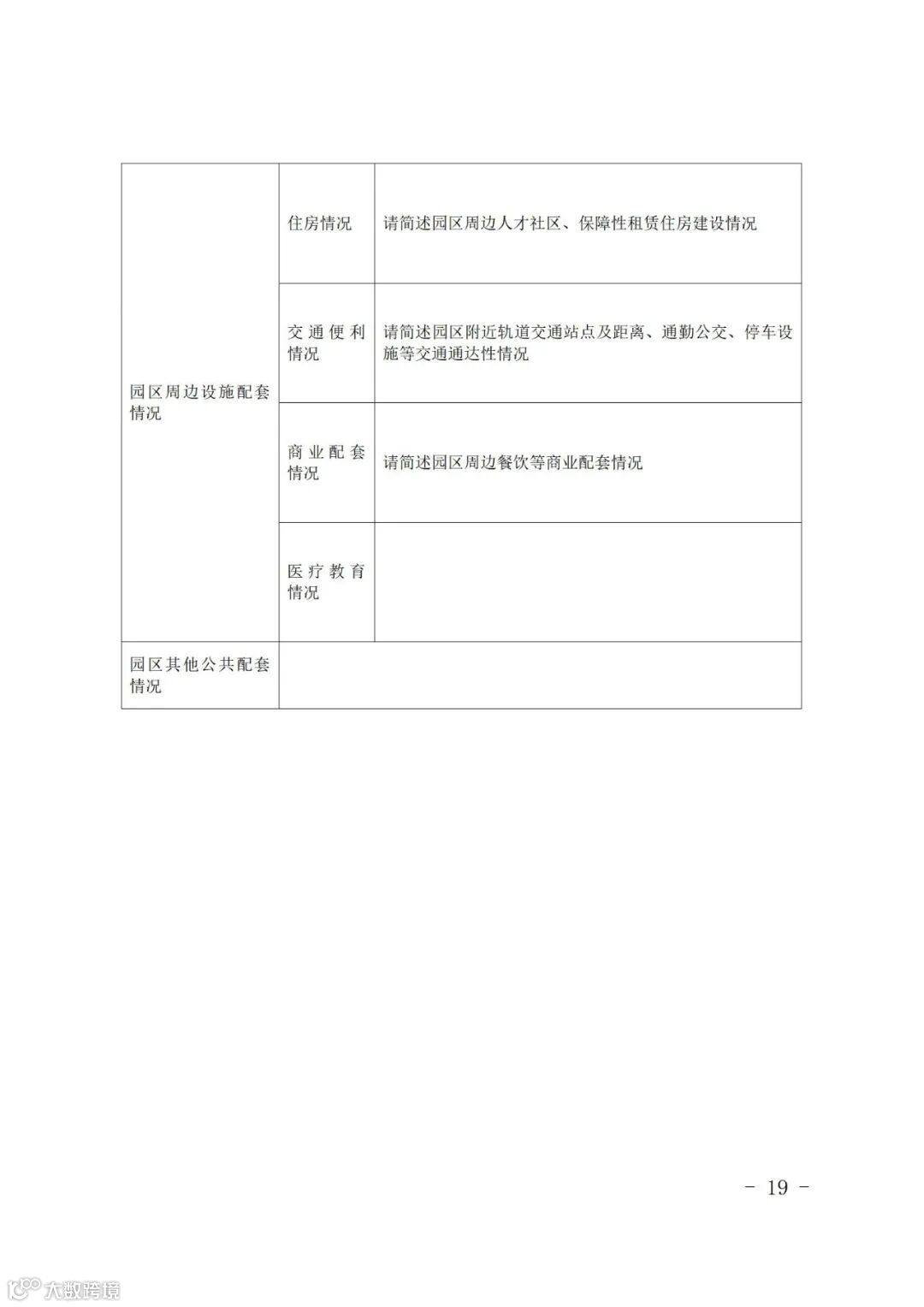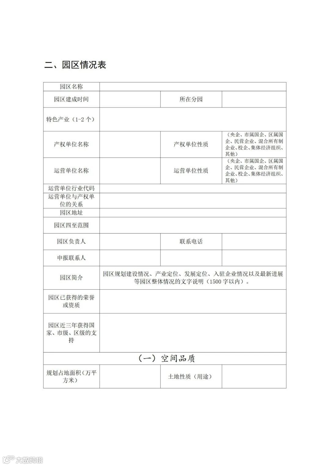1.空间品质:土地或空间资源应产权清晰,四至范围明确,符合产业发展要求,能够满足初创期、加速期及成熟期等不同发展阶段企业的空间需求。园区规划建设面积或规划占地面积不低于10万平方米。对全市重点支持布局和发展的园区,或在中心城区内具有较强代表性、引领性和示范性的园区,规划建设面积或规划占地面积可适当放宽,原则上不低于5万平方米。