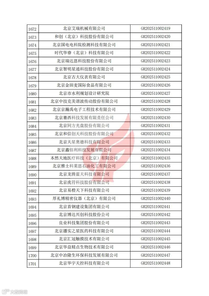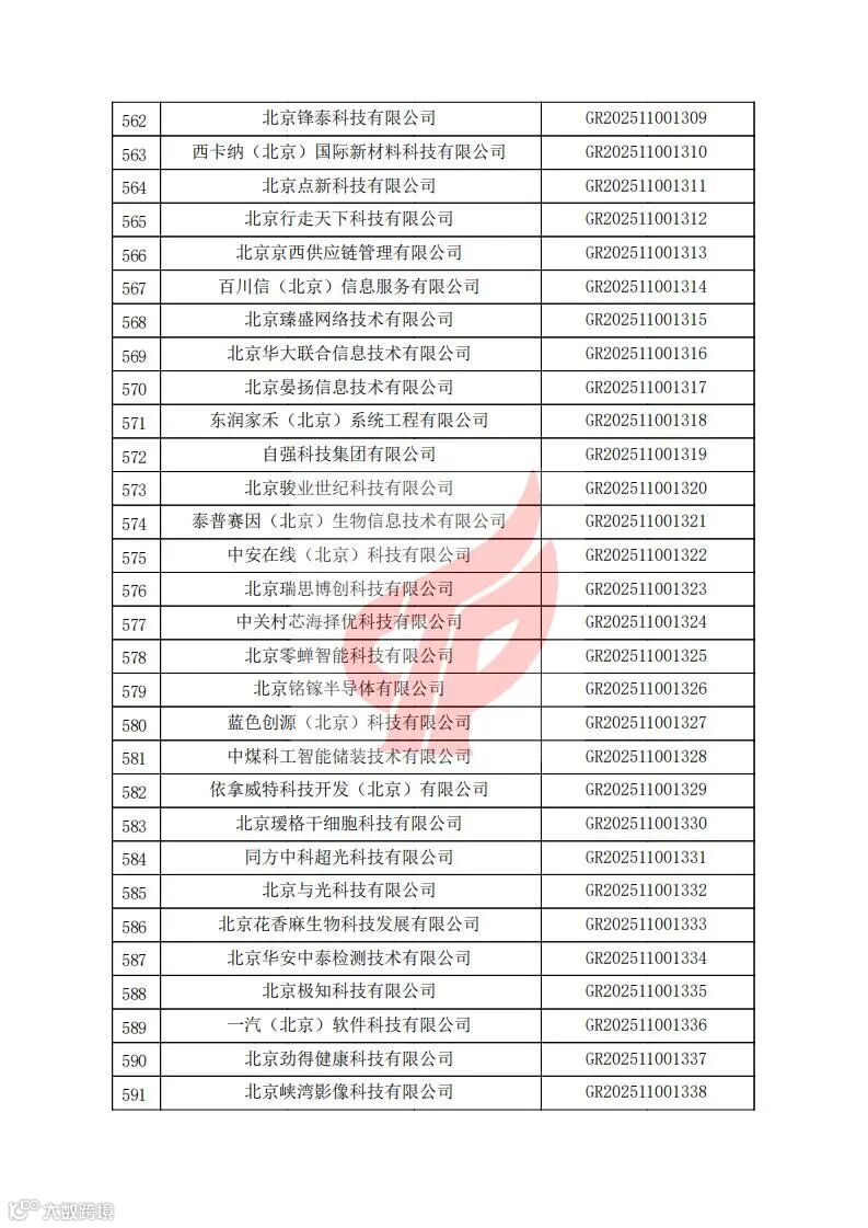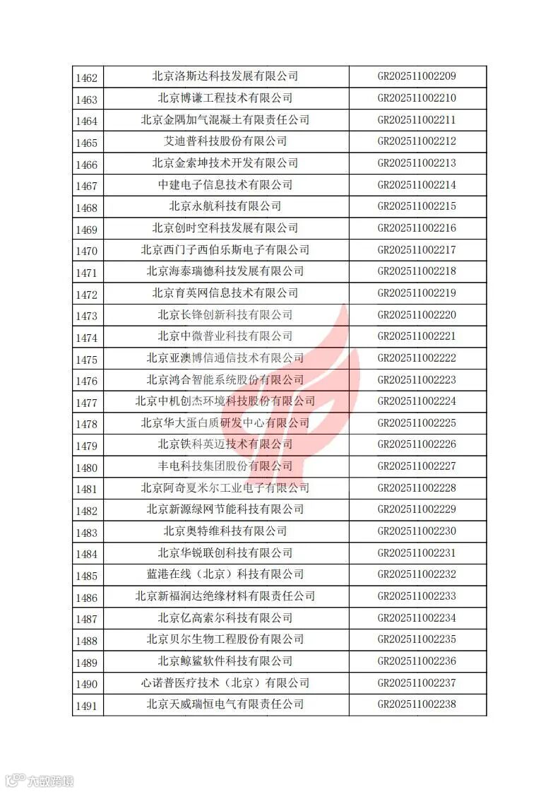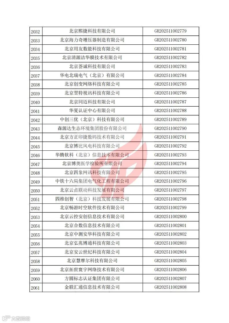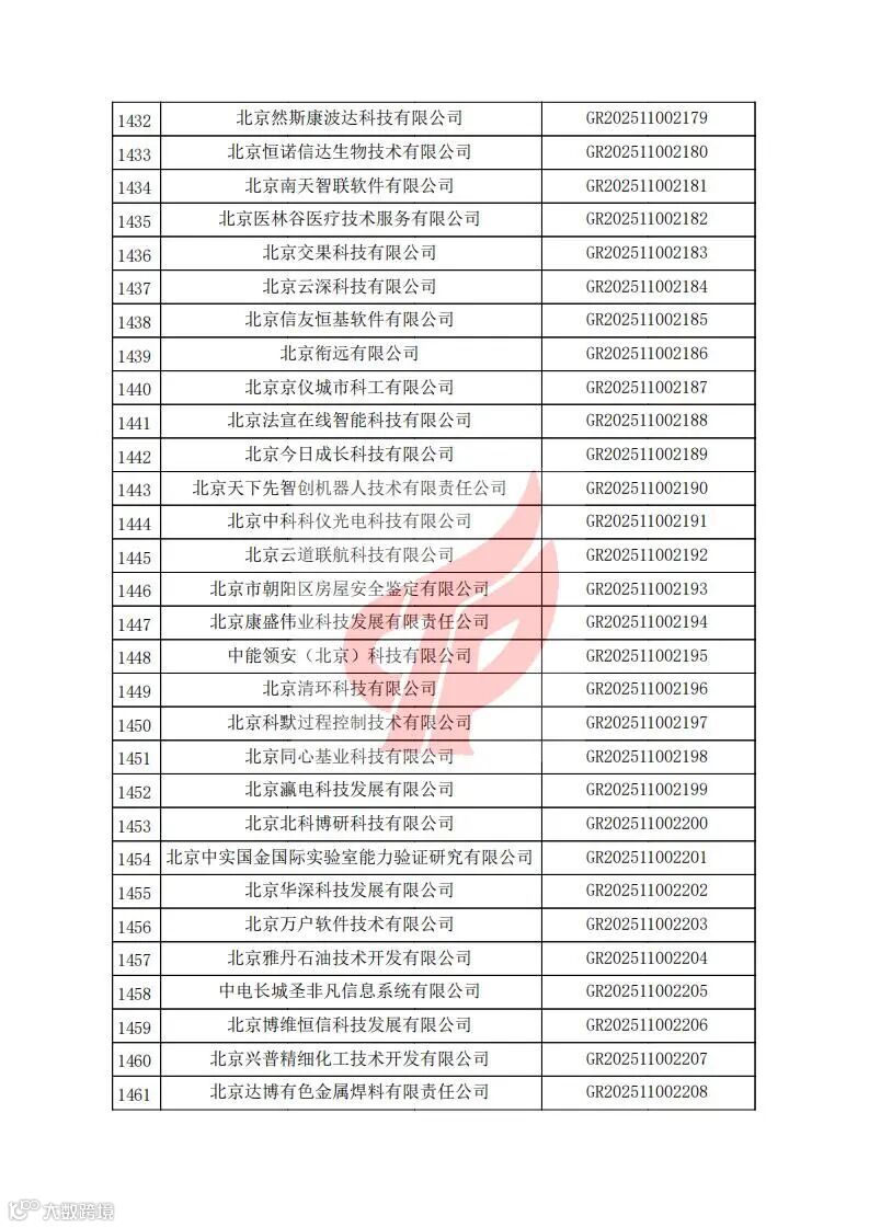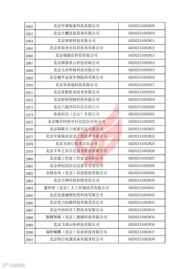 对北京市认定机构2025年认定报备的第二批高新技术企业进行备案的公告