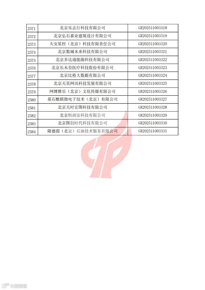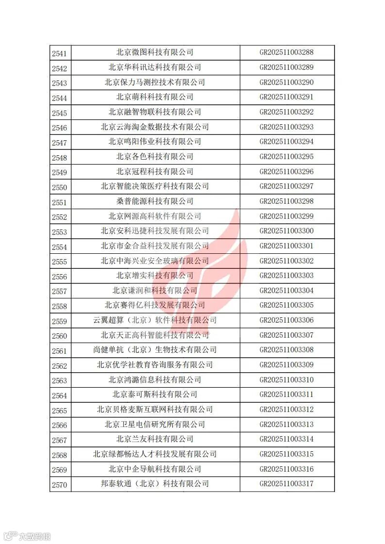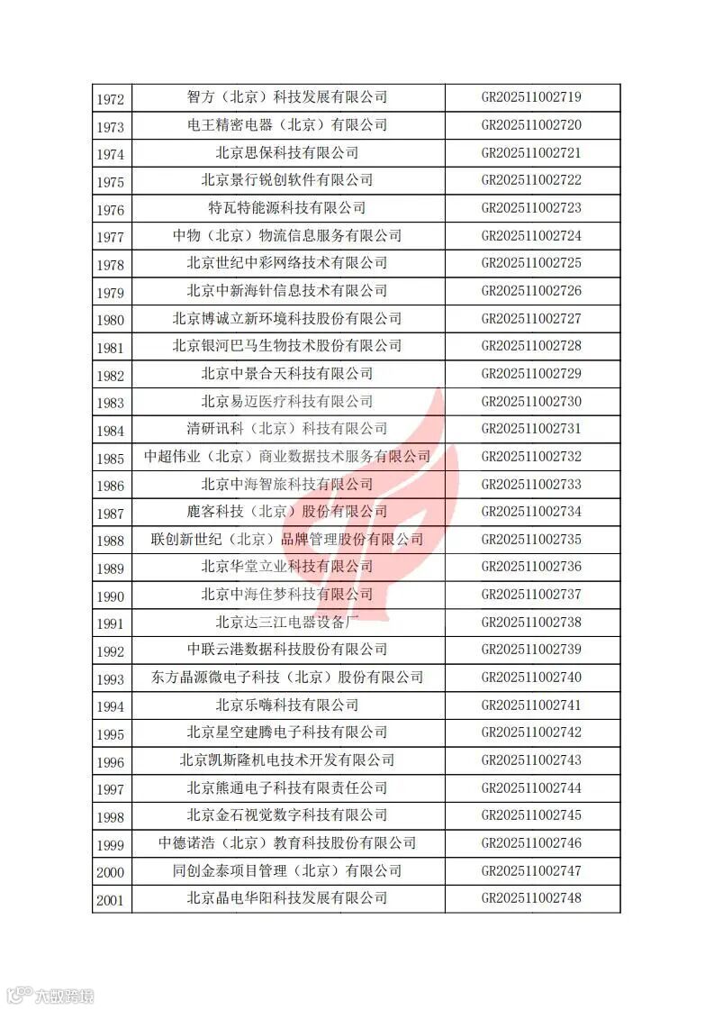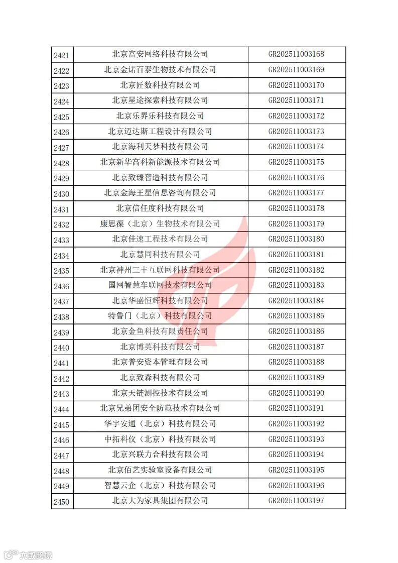 根据《高新技术企业认定管理办法》(国科发火〔2016〕32号)和《高新技术企业认定管理工作指引》(国科发火〔2016〕195号)有关规定,现对北京市认定机构2025年认定报备的第二批2584家高新技术企业备案名单(详见附件)予以公告。