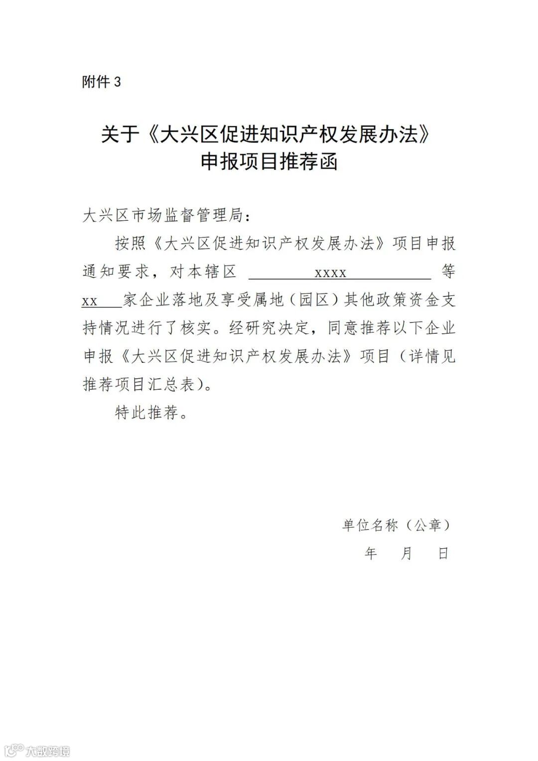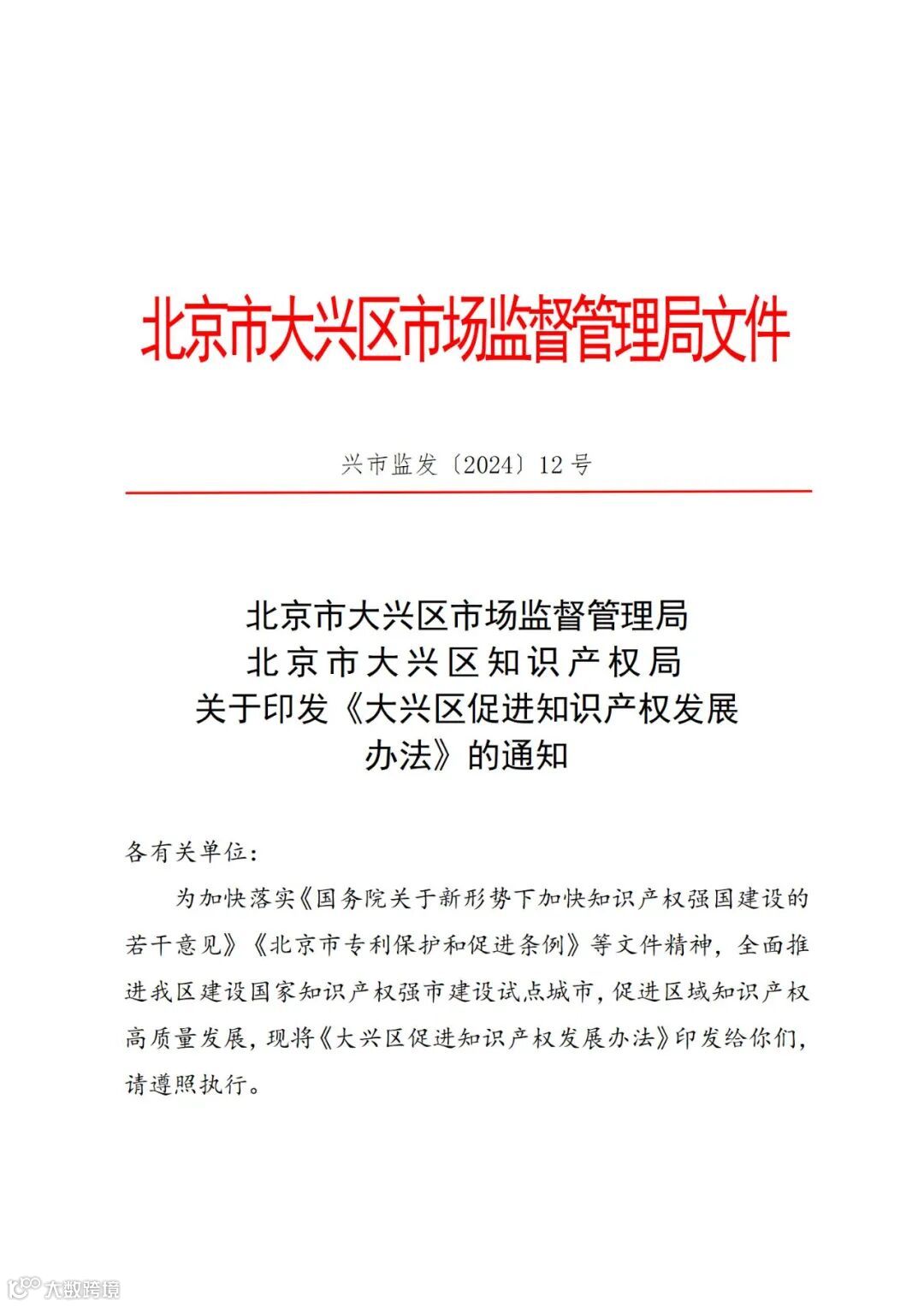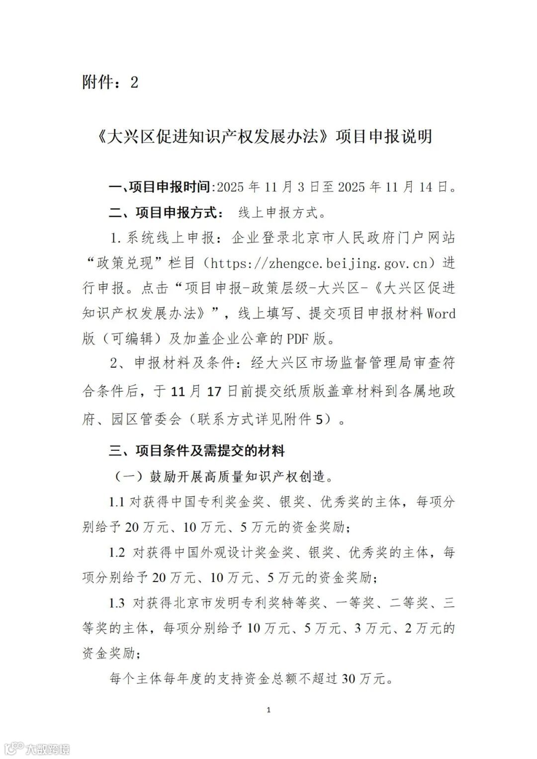 (https://zhengce.beijing.gov.cn)-“项目申报-政策层级-大兴区-《大兴区促进知识产权发展办法》”进行申报。