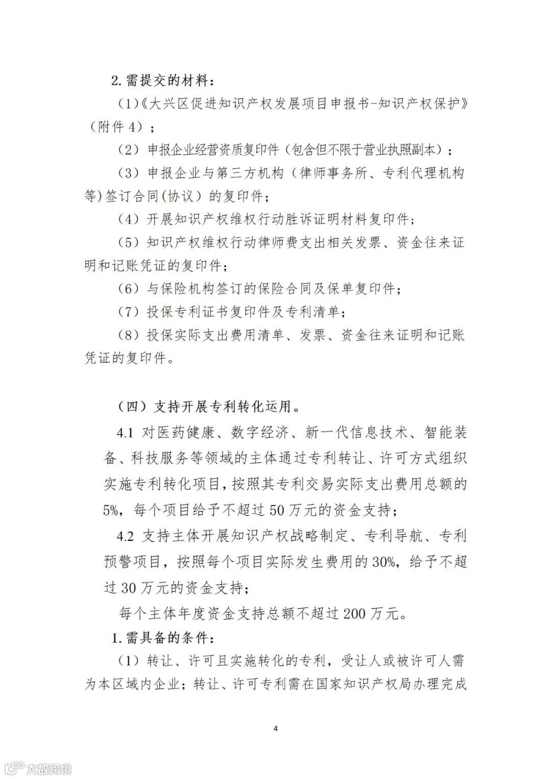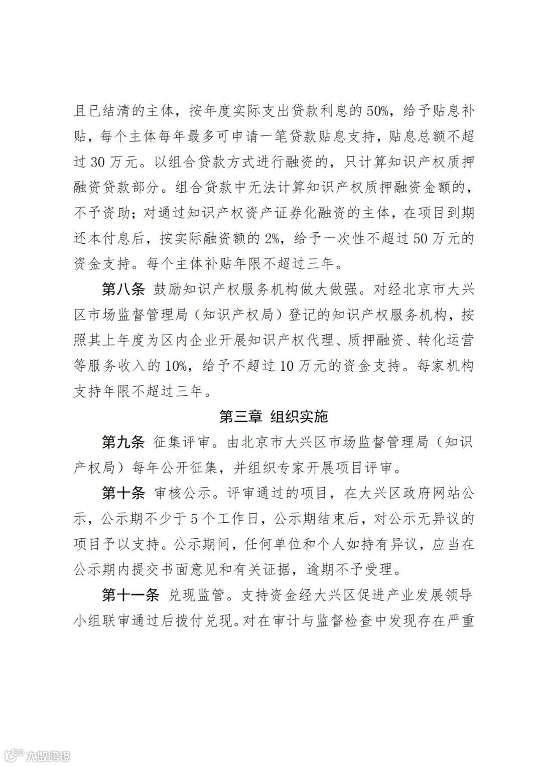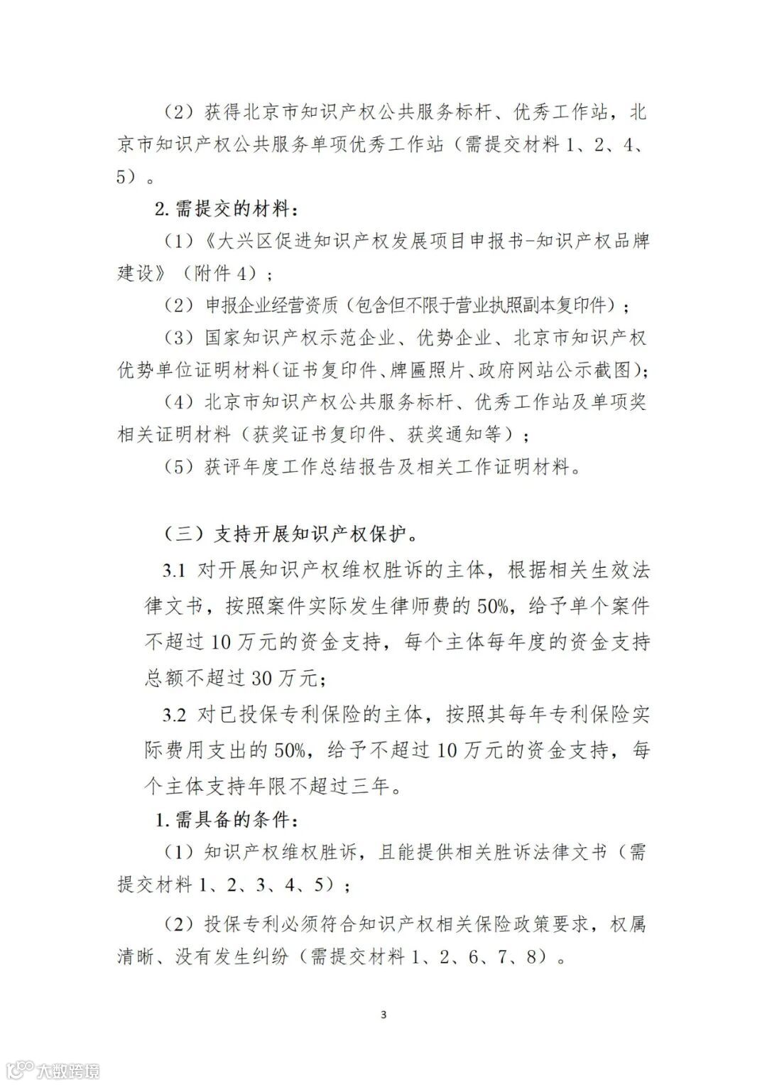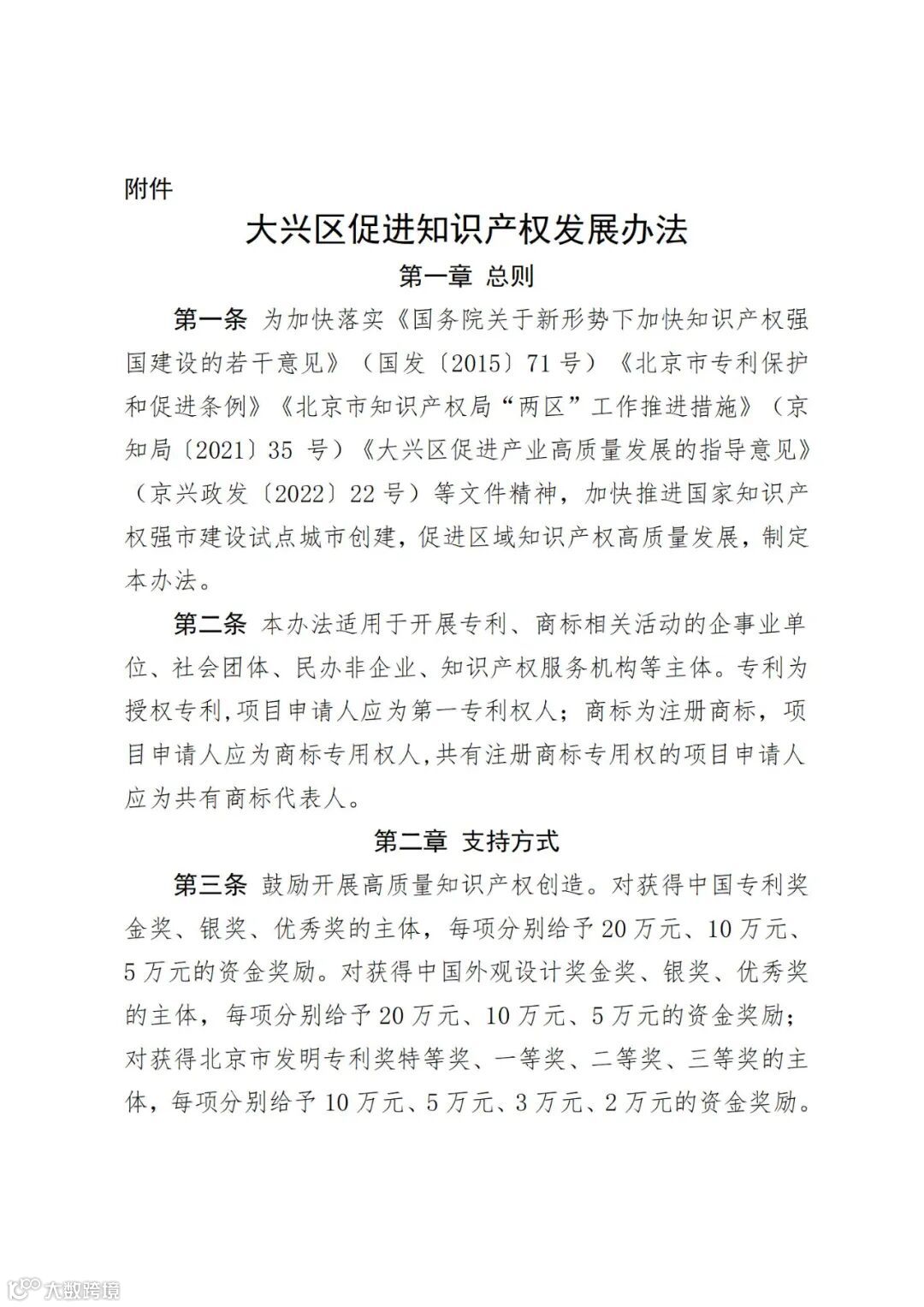(https://zhengce.beijing.gov.cn)-“项目申报-政策层级-大兴区-《大兴区促进知识产权发展办法》”进行申报。