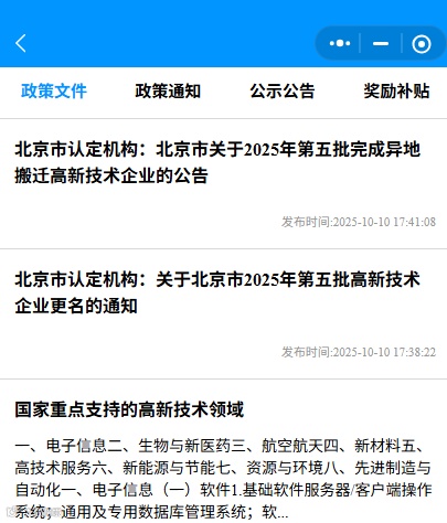 而这款小程序直接把“分散的补贴政策” 搬到了企业眼前。它会实时同步国家及北京市、区的科技资讯,涵盖 “高企专项补贴”“研发费用加计扣除辅助政策”“专精特新企业奖励”“科技成果转化补贴” 等,且按照“国家高新技术企业”“中关村高新技术企业”“科技型中小企业”“专精特新中小企业”“专精特新小巨人企业”“创新型中小企业”“新技术新产品(服务)”“企业技术中心”分类标签化。