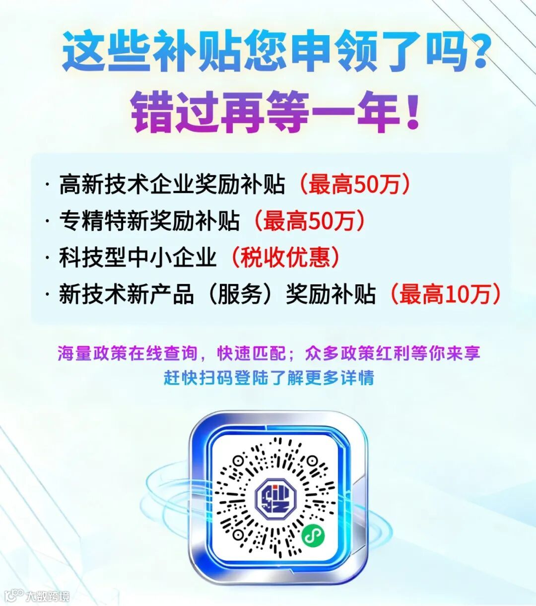 如果你也是高企、科小企业,不想再被 “资质盯防”“补贴难找” 困扰,现在就扫码下方二维码,免费注册试用,让这个小程序帮你管好资质、抓住补贴,省心又高效!