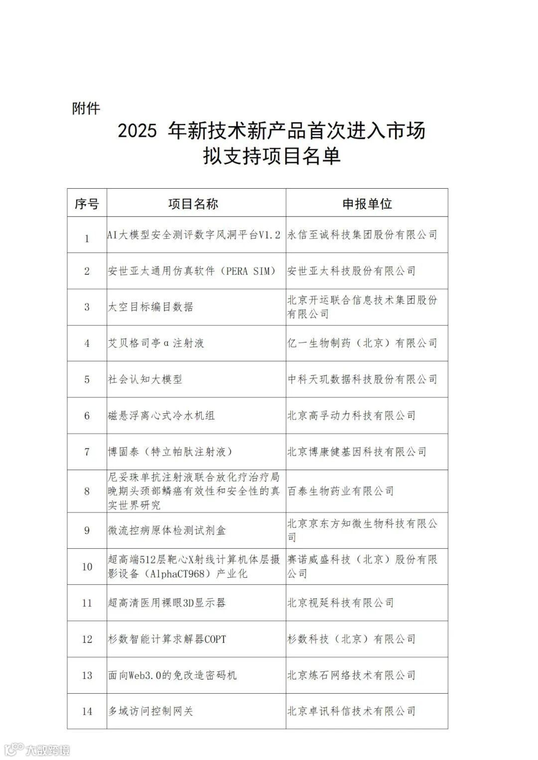 北京市科学技术委员会、中关村科技园区管理委员会关于公示2025年新技术新产品首次进入市场拟支持项目的通知