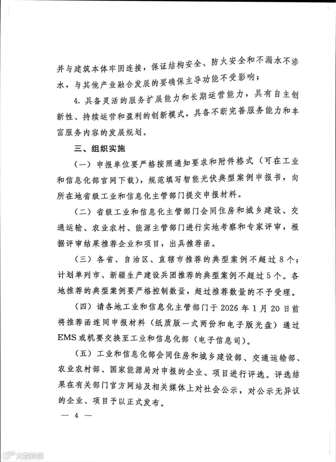 申报单位要严格按照通知要求和附件格式(可在工业和信息化部官网下载),规范填写智能光伏案例申报书,并于2026年1月9号前将申报材料(纸质版一式四份和电子版光盘两份)报送至北京市经济和信息化局(北京市通州区留庄路3号院1号楼),盖章电子版材料同步发送至邮箱