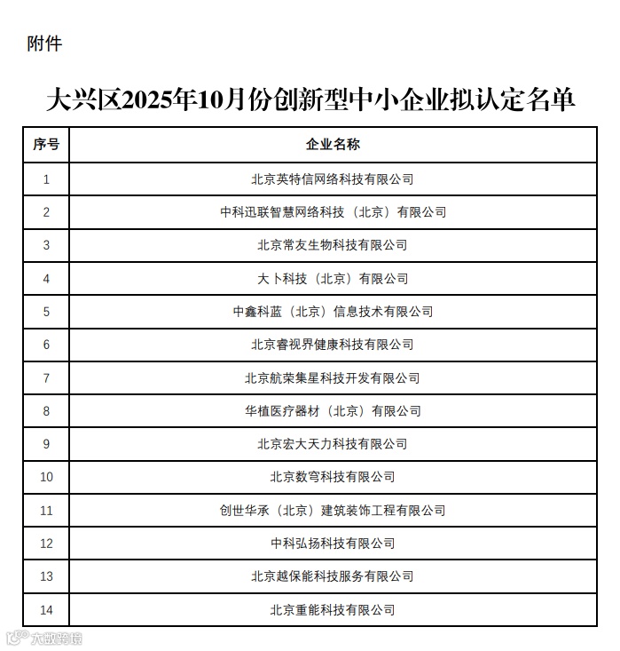大兴区2025年10月份创新型中小企业拟认定名单的公示