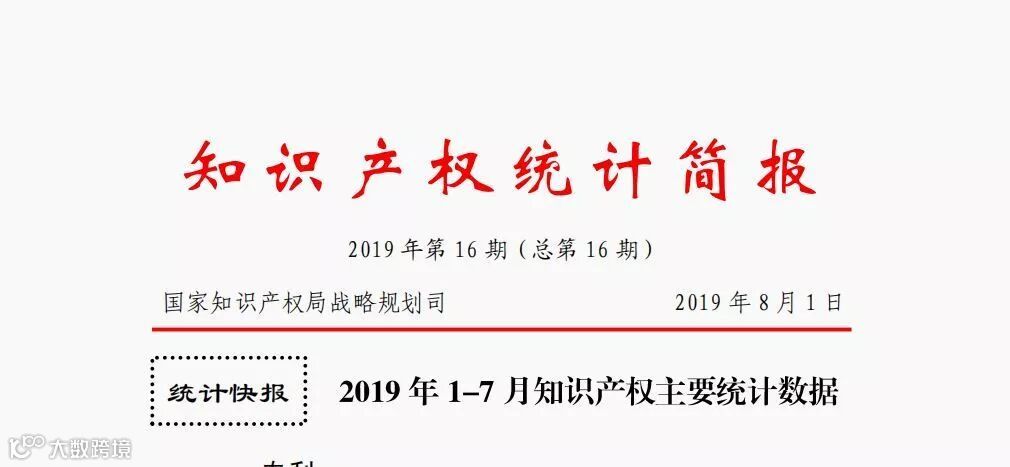 原标题:国知局发布2019年1-7月专利、商标、地理标志等统计数据