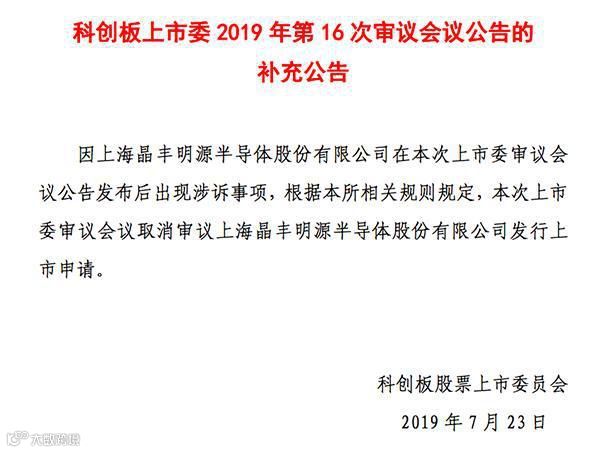 7月23日,上海证券交易所官网显示,科创板上市委发布了2019年第16次审议会议补充公告。公告称:“因上海晶丰明源半导体股份有限公司在本次上市委审议会议公告发布后出现涉诉事项,根据本所相关规则规定,本次上市委审议会议取消审议上海晶丰明源半导体股份有限公司发行上市申请。”