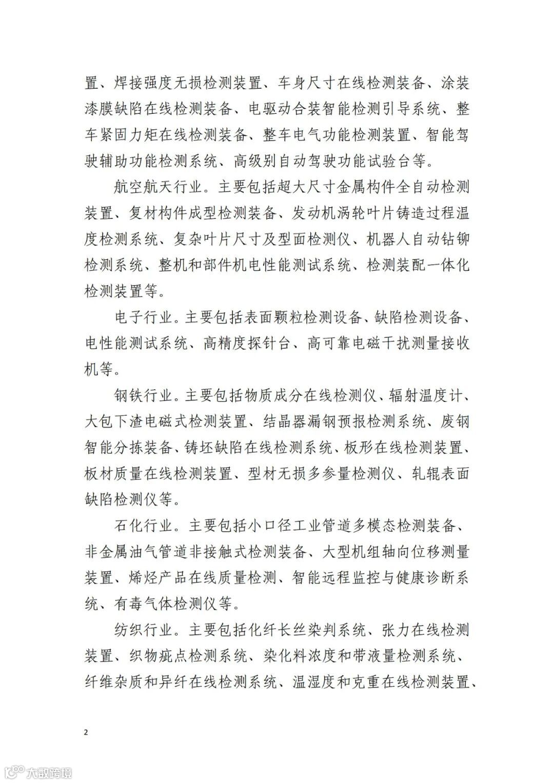 钢铁行业。主要包括物质成分在线检测仪、辐射温度计、大包下渣电磁式检测装置、结晶器漏钢预报检测系统、废钢智能分拣装备、铸坯缺陷在线检测系统、板形在线检测装置、板材质量在线检测装置、型材无损多参量检测仪、轧辊表面缺陷检测仪等。