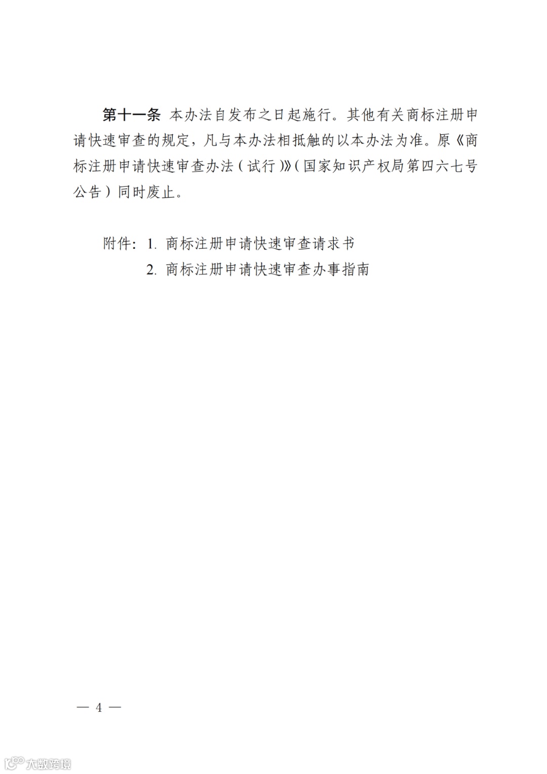 现将修订后的《商标注册申请快速审查办法》予以发布,自发布之日起施行。