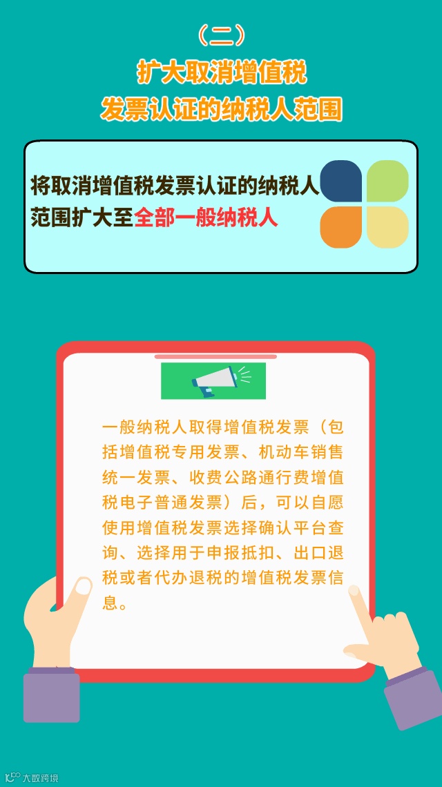 二、扩大取消增值税发票认证的纳税人范围。将取消增值税发票认证的纳税人范围扩大至全部一般纳税人。一般纳税人取得增值税发票(包括增值税专用发票、机动车销售统一发票、收费公路通行费增值税电子普通发票,下同)后,可以自愿使用增值税发票选择确认平台查询、选择用于申报抵扣、出口退税或者代办退税的增值税发票信息。