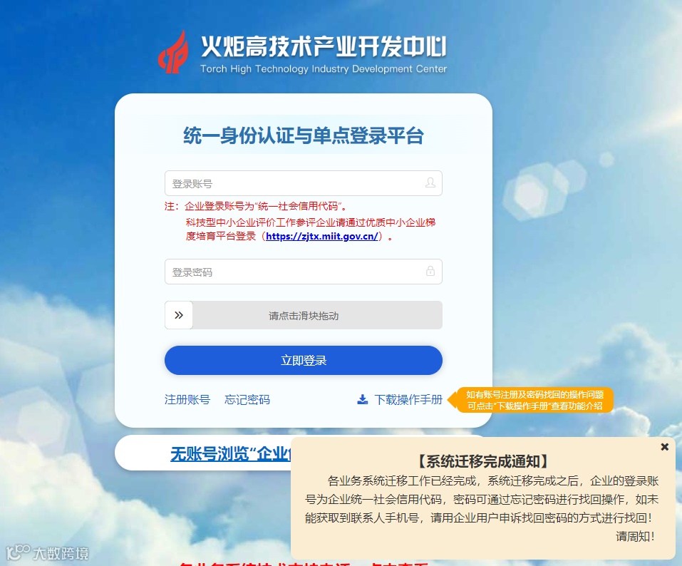 由于高新申报网址从科技政务服务平台迁移到火炬高技术产业开发中心,因此认定过国高新的企业朋友们需要进行账号密码的迁移且必须重置密码,账号一般为统一社会信用代码,重置密码则需在火炬高技术产业开发中心网站首页点击"忘记密码"进行密码重置。初次认定的企业直接进行注册即可。