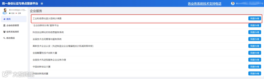 2、点击工业和信息化部火炬统计调查后的"我要办理"