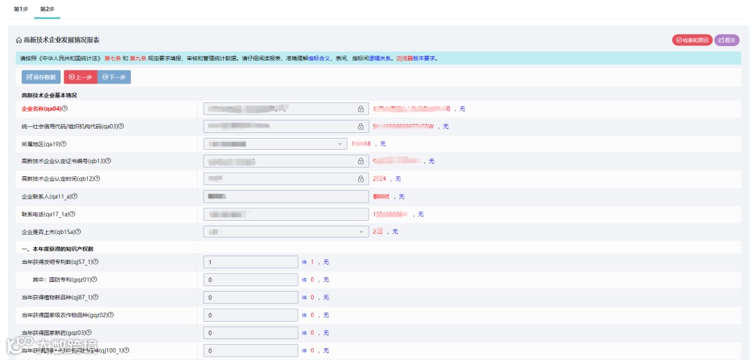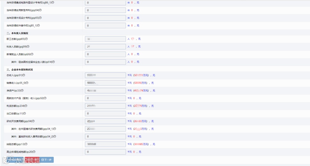 6、第二步:填写上一年度知识产权、科技人员、研发费用、经营收入等相关内容