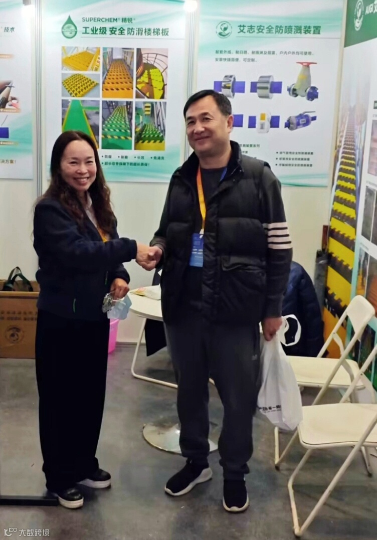 在安全防滑覆盖板展台前面,大家纷纷亲自登上防滑楼梯展示架,试用楼梯防滑板的防滑性能,并有针对性的提出该产品在安装、防滑、寿命、清洗等多方面的问题,艾志公司人员都给予了耐心细致的请解👇。