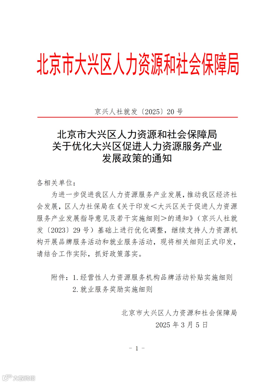 北京市大兴区人力资源和社会保障局关于优化大兴区促进人力资源服务产业发展政策的通知