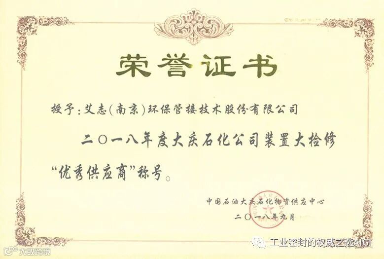 近日大庆石化物资供应中心一年一度的优秀供应商评选活动正式告一段落,经过公平公正的审核和筛选,艾志环保公司在2018年供方履约评估中取得优异成绩,艾志环保公司被正式授予“大庆石化2018年度优秀供方”称号。