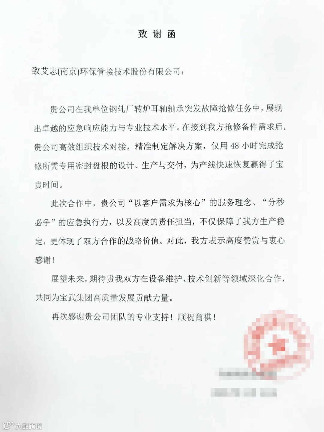 近日,艾志工业收到了一封来自宝武旗下某客户的感谢信,信中,客户对我司应急响应能力与专业技术水平给予了充分的肯定。