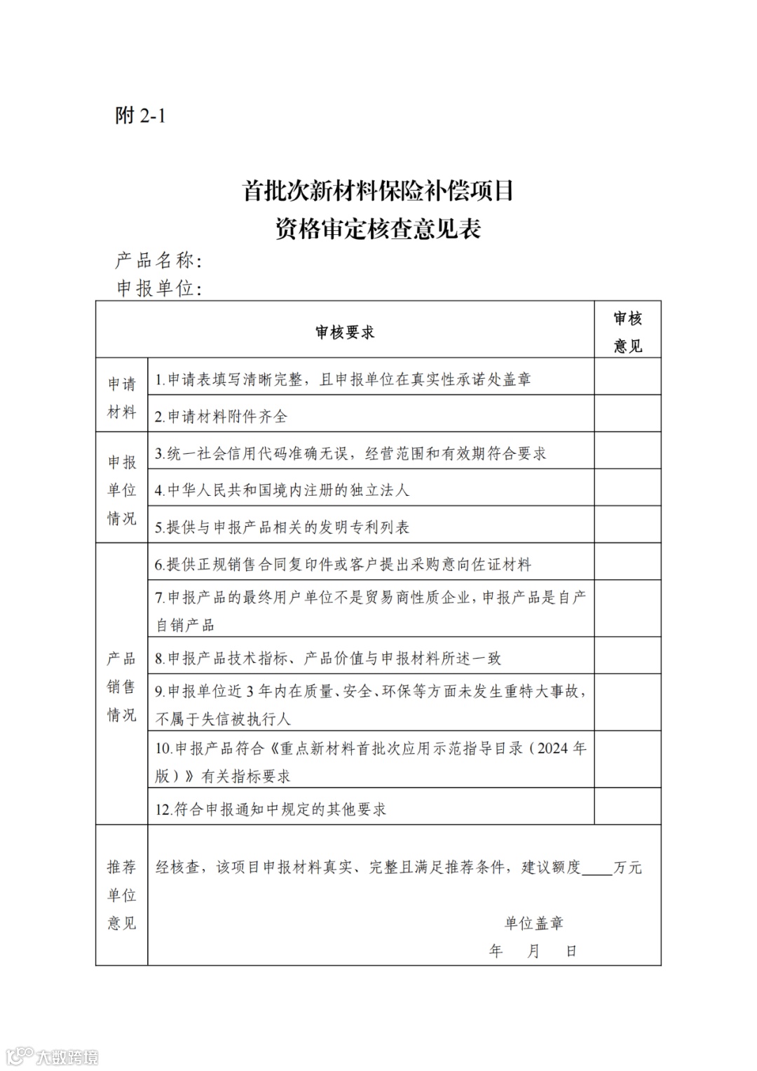 (二)推荐单位审核。推荐单位按要求对本地区或所属企业开展资格审核,重点核查申报材料的完整性和有效性、产品技术参数的符合性和价值合理性等,形成核查意见,报送工业和信息化部(原材料工业司),报送材料要求见附件2。