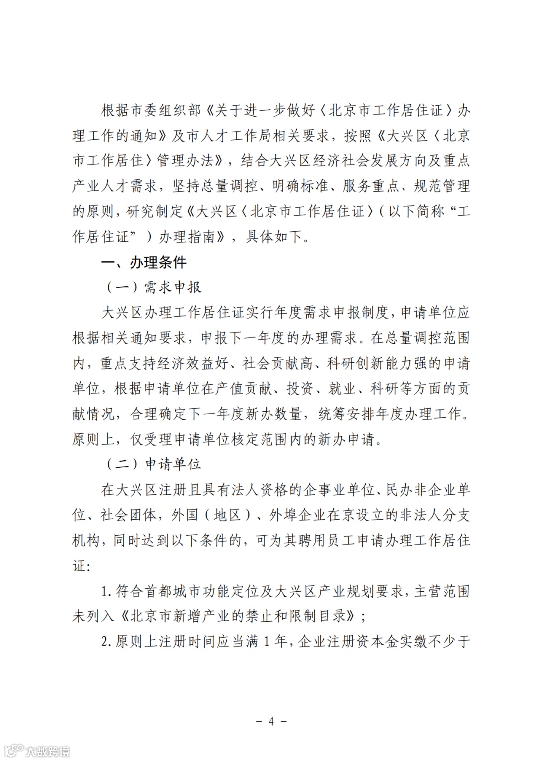 申报单位应在大兴区注册、纳税且具有法人资格的企事业单位、民办非企业单位、社会团体,外国(地区)、外埠企业在京设立的非法人分支机构,所属产业领域符合首都城市功能定位及大兴区产业发展规划,符合《大兴区〈北京市工作居住证〉办理指南》(见附件4)所列的申请单位基本条件要求。