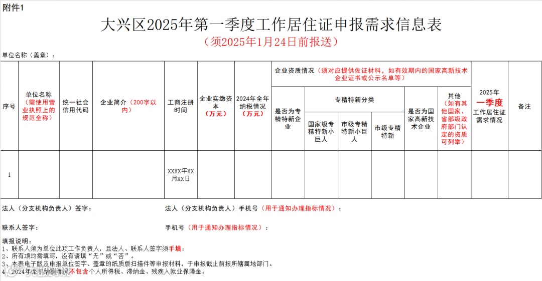 1.大兴区2025年第一季度工作居住证申报需求信息表(见附件1)EXCEL电子版及加盖单位公章的纸质版扫描件;