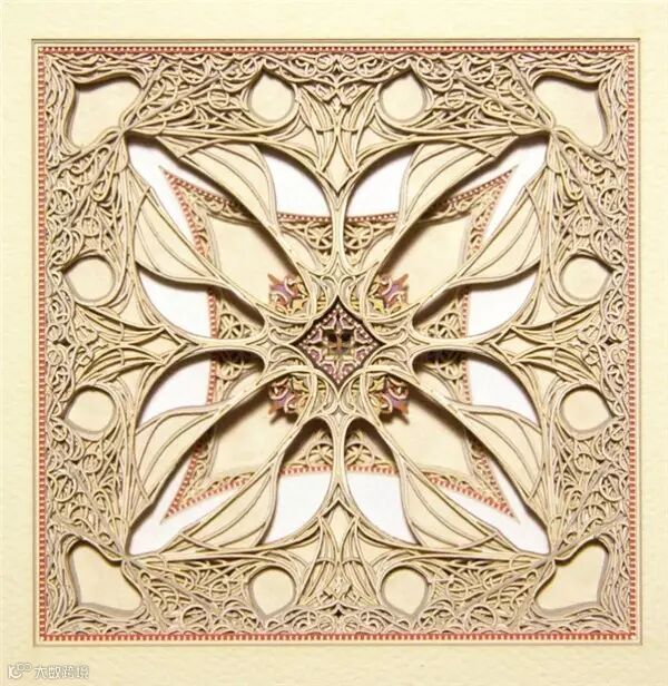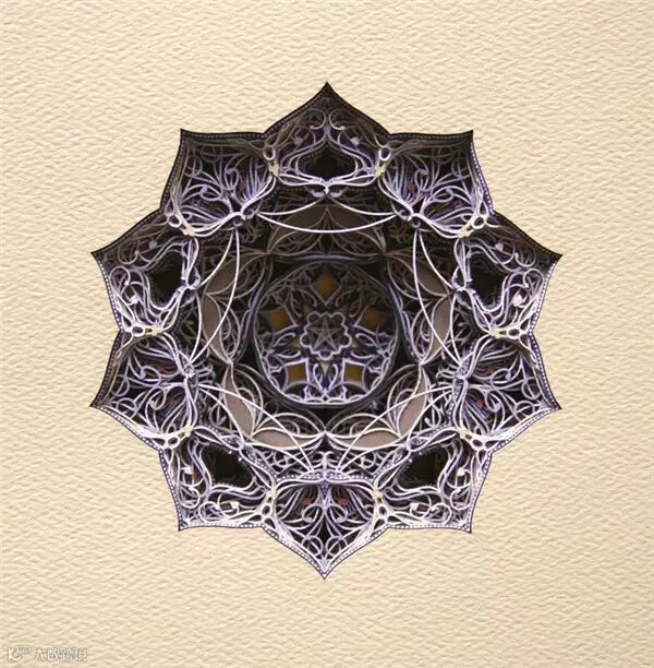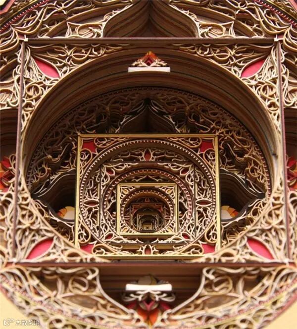 Eric Standley将数百张经过雕琢的硬纸板组合起来,通过镂空与色彩变化,构成如同法国沙特尔圣母大教堂中彩绘玻璃玫瑰窗般精美的纸雕作品,在原本的哥特风格基础上, Eric又融入了洛可可般的繁饰与中东清真寺风格的优美曲线,令人赞叹。