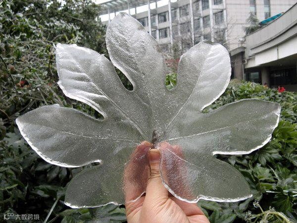 冻雨后,水被凝固在叶面上形成的冰叶