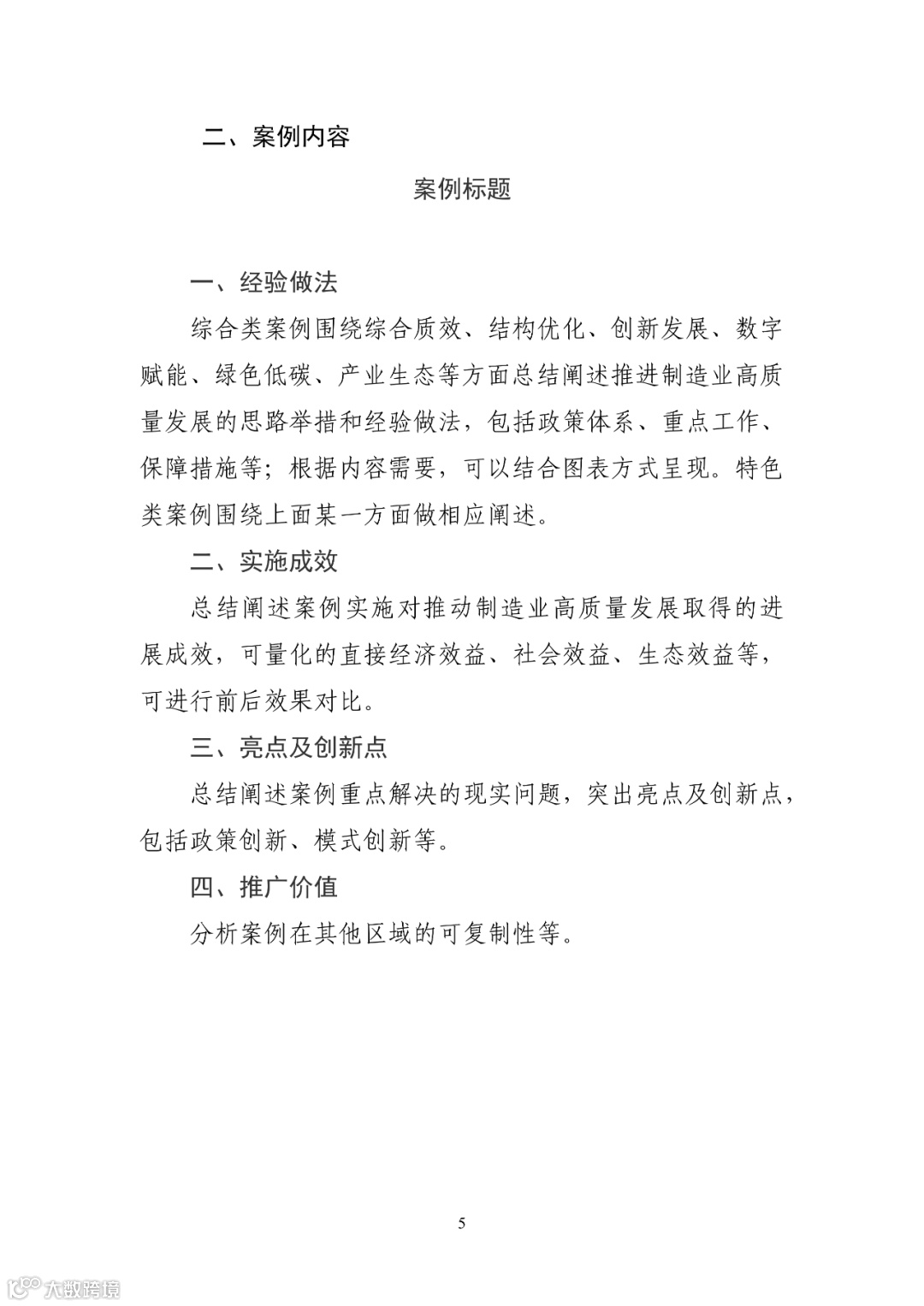 (二)案例须主题明确、重点突出、逻辑清晰、材料真实,主要指标全省领先或进步较快,推动制造业高质量发展取得显著成效,有较强的借鉴意义。