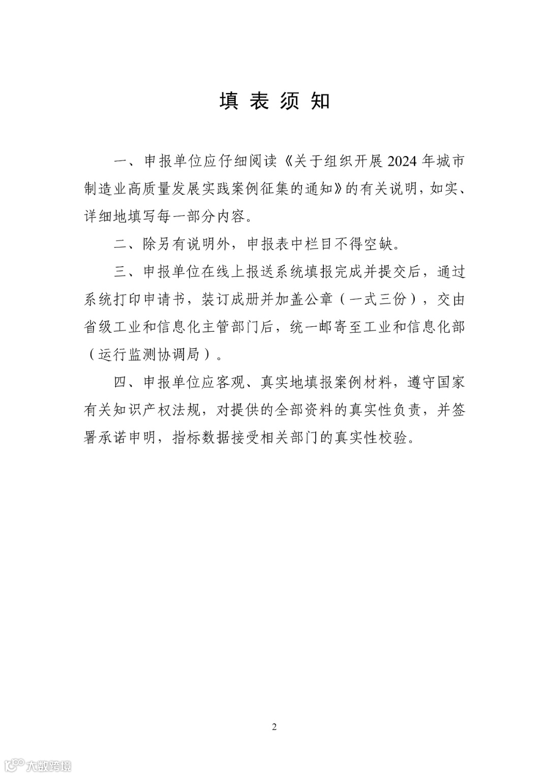 申报单位使用专用账号登录制造业高质量发展综合服务平台,填写《2024年城市制造业高质量发展实践案例申报书》(附件1),申报截止时间为2024年9月13日。