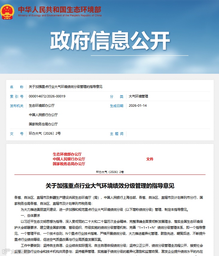 三部门(生态环境部办公厅、中国人民银行办公厅、国家税务总局办公厅)联合发文,关于印发《关于加强重点行业大气环境绩效分级管理的指导意见》的政策,加强重点行业大气环境绩效分级管理。
