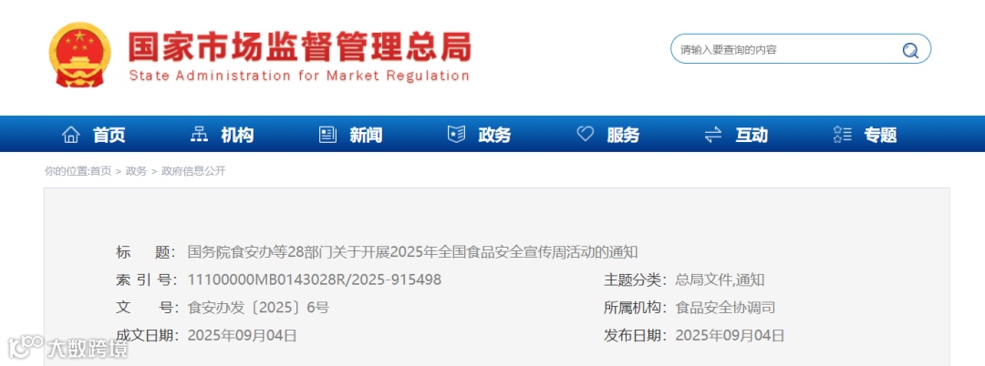 9月4日,国务院食安办、中央精神文明建设办公室、中央网信办、最高人民法院、最高人民检察院、教育部、工业和信息化部、公安部、民政部、司法部、生态环境部、交通运输部、农业农村部、商务部、文化和旅游部、国家卫生健康委、海关总署、市场监管总局、金融监管总局、广电总局、国家粮食和储备局、国家林草局、中国民航局、共青团中央、中国科协、中国贸促会、供销合作总社、中国国家铁路集团有限公司28部门联合印发《关于开展2025年全国食品安全宣传周活动的通知》(以下简称《通知》),2025年全国食品安全宣传周以“尚德守法 共享食安”为主题,将于9月11日启动。