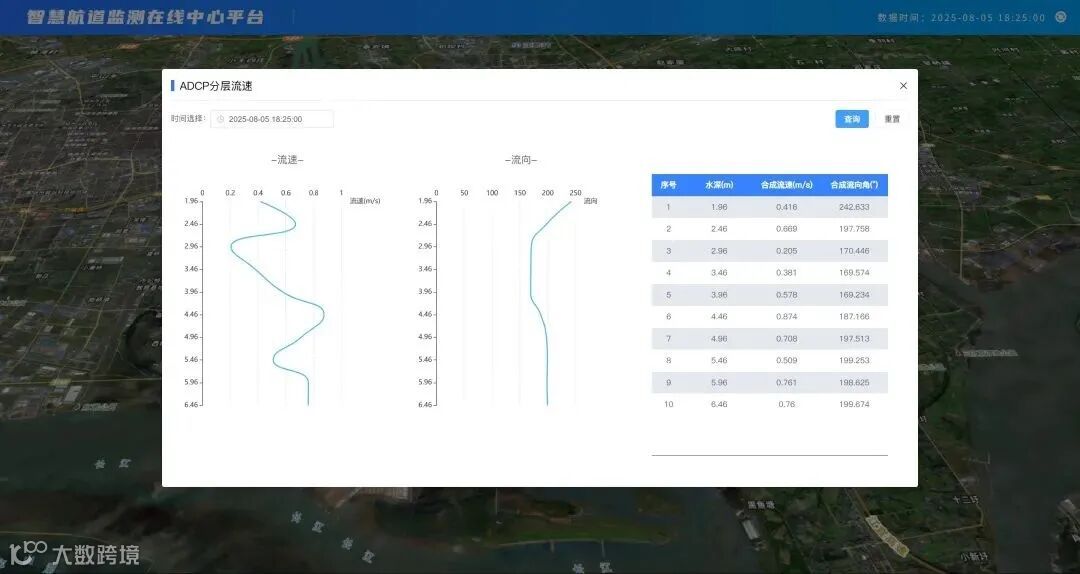 该装置采用ADCP(声学多普勒流速剖面仪)在线测流系统,利用集成声学测量、平台设计、能源供应、数据传输和远程监控等技术,进行24小时不间断监测关键点位不同深度级的流速、流向及水深等多项水文指标,实现了复杂潮汐环境下水文数据的实时精准采集。