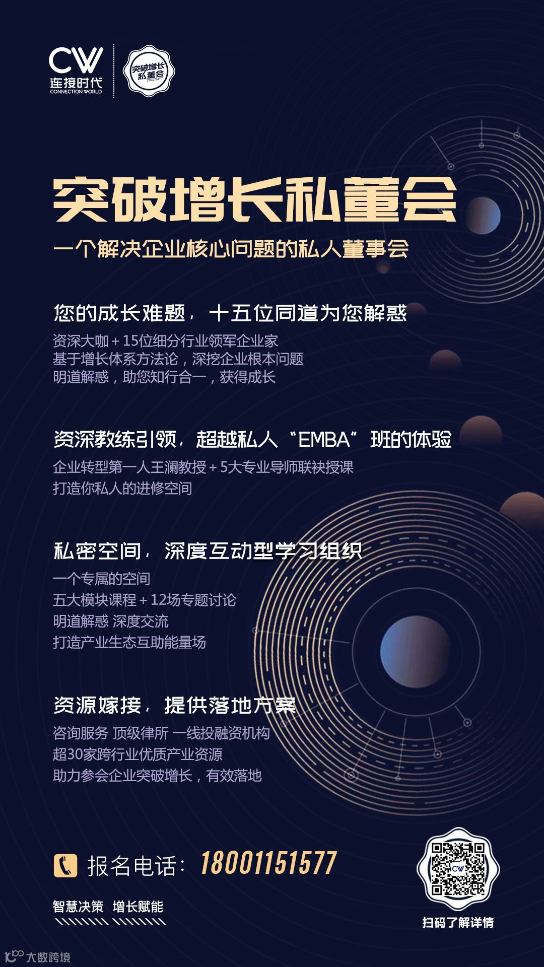 而今,作为贴合时代创新产物的突破增长私董会,已联合了超30家跨行业优质产业资源,包括咨询服务、顶级律所、人力资源、一线投融资机构、企业服务机构等等六大门类,在助力参会企业有效对接资源,破解成长型企业家缺钱、缺人、缺服务、缺资源等现实问题的同时,致力于成为客户的一扇窗,一座灯塔,一个一站式企业家增长赋能+资源对接的服务平台。