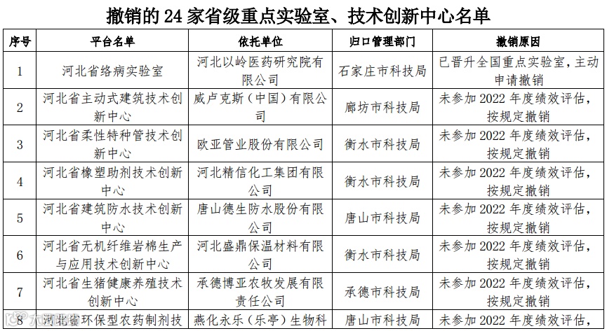 根据《河北省重点实验室建设与运行管理办法》(冀科平规〔2023〕3号)、《河北省技术创新中心建设与运行管理办法》(冀科平函〔2023〕2号)有关规定,结合2022年度绩效评估和建设任务验收结果,对未参加2022年度绩效评估、两次未通过建设任务验收的省级技术创新中心和依托单位申请撤销的24家省级研发平台予以撤销,请通知相关单位不再纳入省级重点实验室、技术创新中心管理序列。