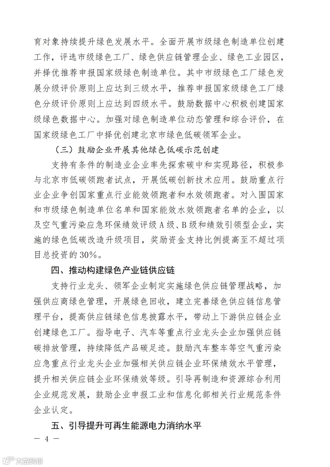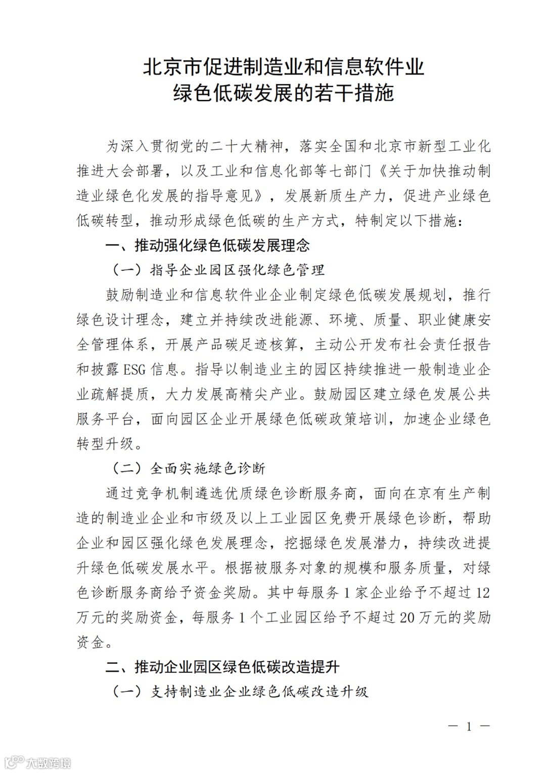 为贯彻落实全国和北京市新型工业化推进大会精神,发展新质生产力,大力推进产业绿色低碳转型,培育产业绿色发展新动能,北京市经济和信息化局制定了《北京市促进制造业和信息软件业绿色低碳发展的若干措施》,现印发给你们,请积极推动实施。