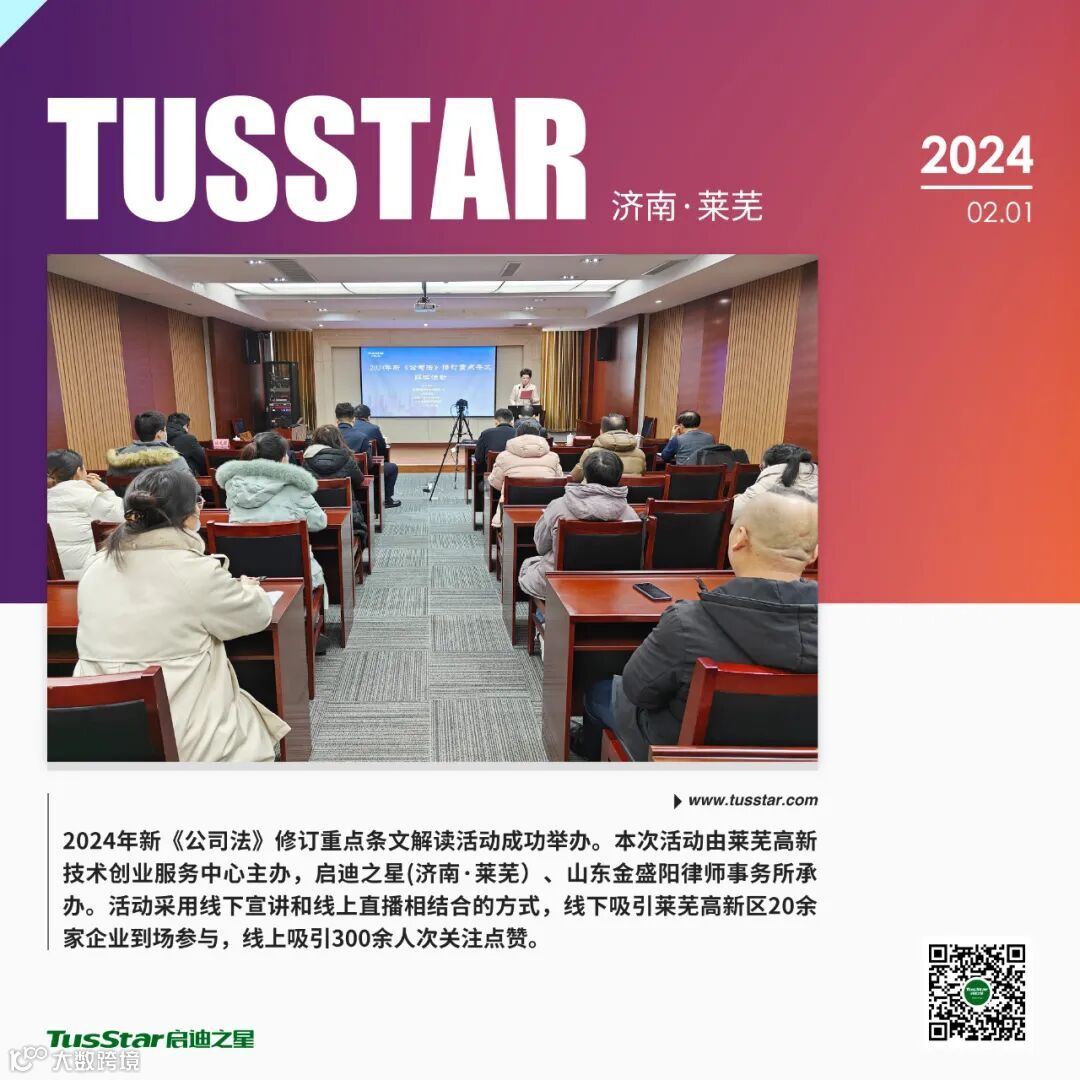 创业讲堂。举办2024年新《公司法》修订重点条文解读活动,线下吸引莱芜高新区20余家企业到场参与,线上吸引300余人次关注点赞;举办2024年企业研发投入合规性培训会,来自莱芜高创中心的15家企业参与活动等。