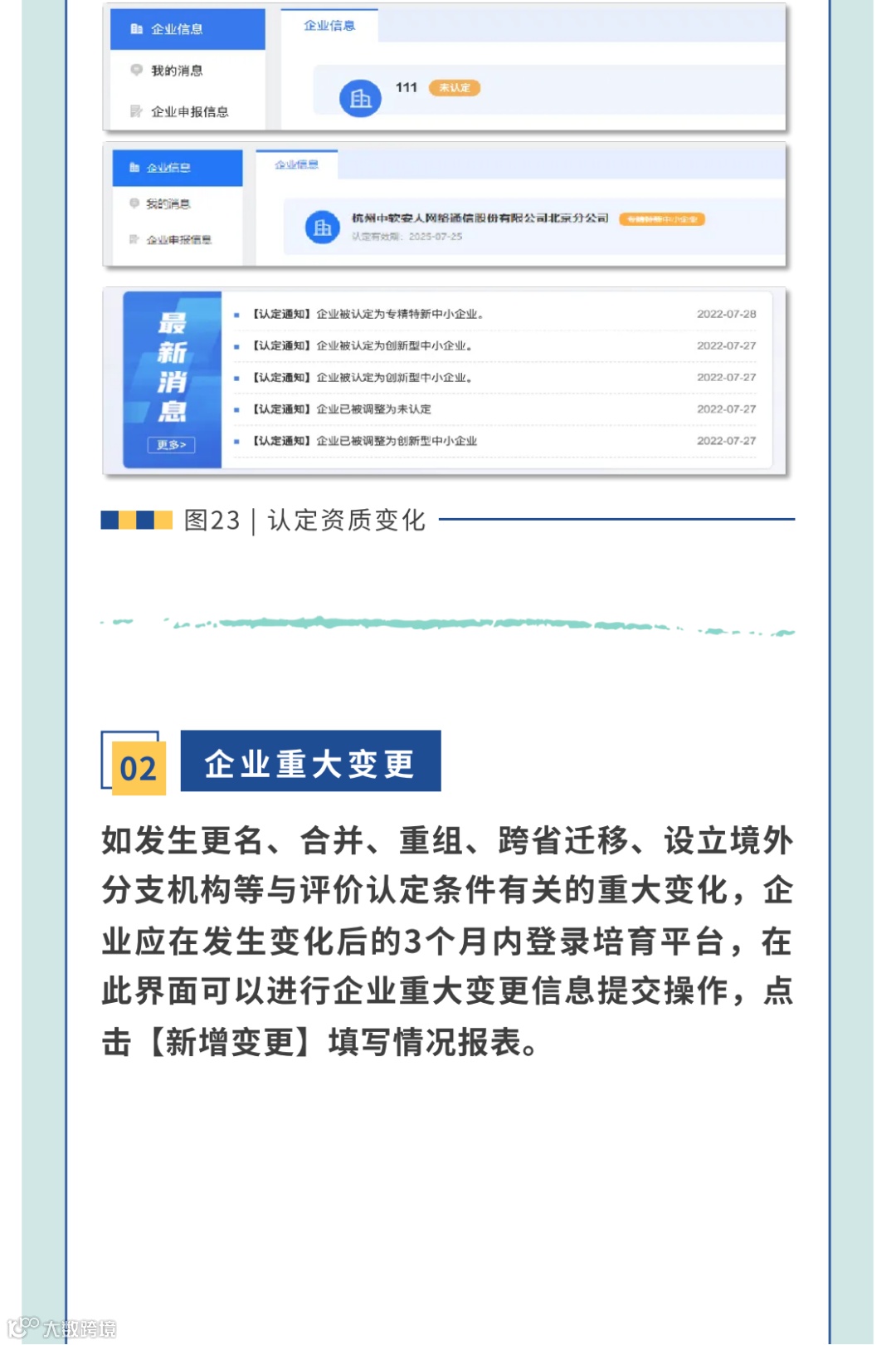 3.有效期内的北京市创新型中小企业、北京市专精特新中小企业和国家专精特新“小巨人”企业,如发生更名、合并、重组、跨省迁移、设立境外分支机构等与评价认定条件有关的重大变化,应在发生变化后的3个月内登录培育平台,填写重大变化情况报告表。对于未在3个月内报告重大变化情况的,取消复核资格,或直接取消认定。