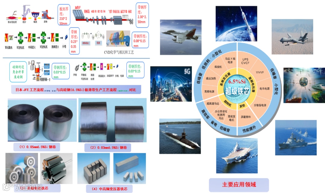 转换。硅含量约3.0%的高级别硅钢制造技术,宝武已进入世界前列,产量稳居世界第一。当硅含量达到6.5%时,合金电阻率增加一倍,铁损大幅下降,磁致伸缩近乎为零。由于6.5%高硅钢加工性能极差,全球只有日本JFE公司独家生产,并且严禁对我国的出口。产研院与国鑫箔材合作引入张凤泉团队,该团队成功颠覆了6.5%高硅钢制造工艺,研制出了整套系列技术,产品性能达到日本水平。目前中试线正在建设中。