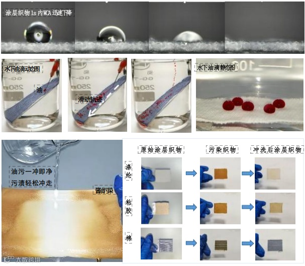 一款被污染的纺织品不在需要洗涤剂的情况下,能通过简单的水流冲洗,就干净如初,不仅给消费者带来极大方便,也减少了水的消耗和污染洗涤剂的排放。很多家纺面料,如衬衣领口等,由于其频繁接触皮肤及外部环境,往往极易沾染各种污渍,如油渍、汗渍或是化妆品残留等。因此,对于这类产品而言,易去污性成为了消费者极为关注的需求要点。然而,目前市面上这类产品非常少,效果不理想。本技术本项目通过一种纺织品的结构化离子水合超亲水设计思路,通过无机材料构建自修复纳米骨架网,并进行亲水性离子沉积,形成多重网络结构,实现纺织品的水下自清洁功能(性能参考下图)。