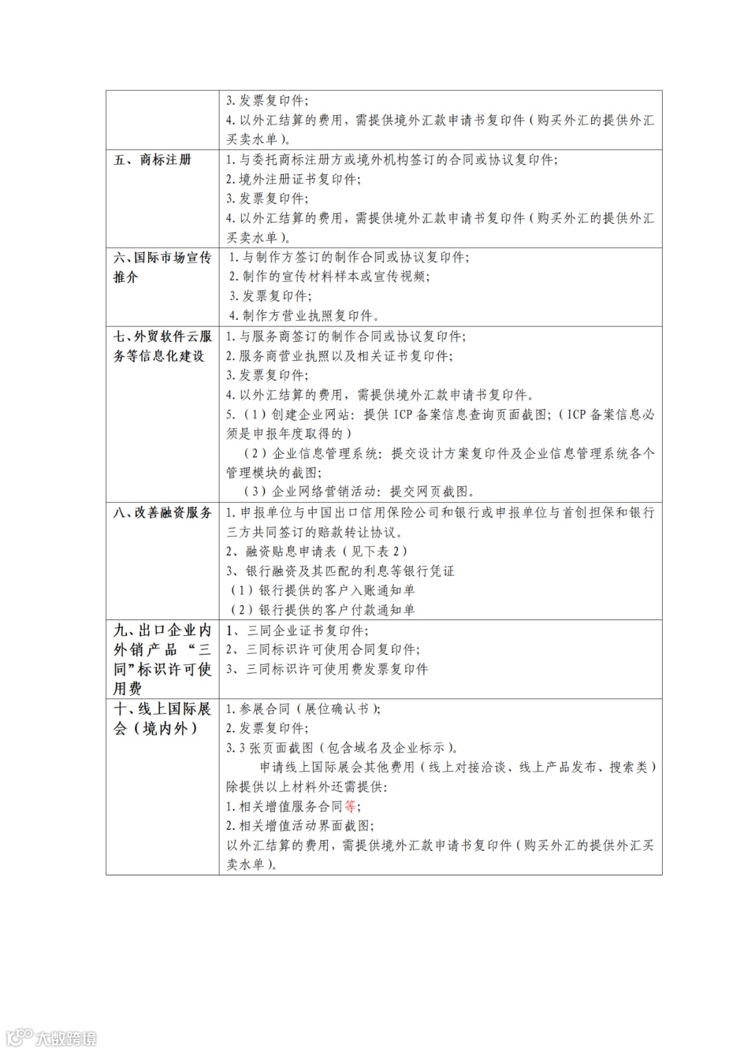 3.支持比例一般为50%;拓展面向拉美、非洲、中东、东欧、东南亚和中亚等新兴国际市场的支持比例可提高到70%,产品认证、出口企业内外销产品“三同”标识许可使用费、线上国际展会(境内外)展位费支持比例可提高到70%。