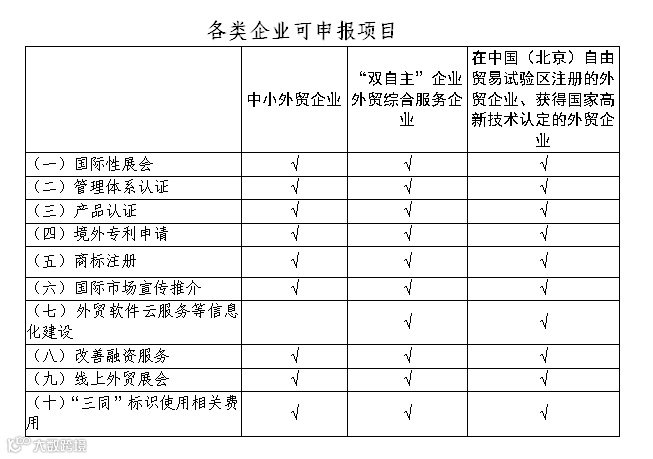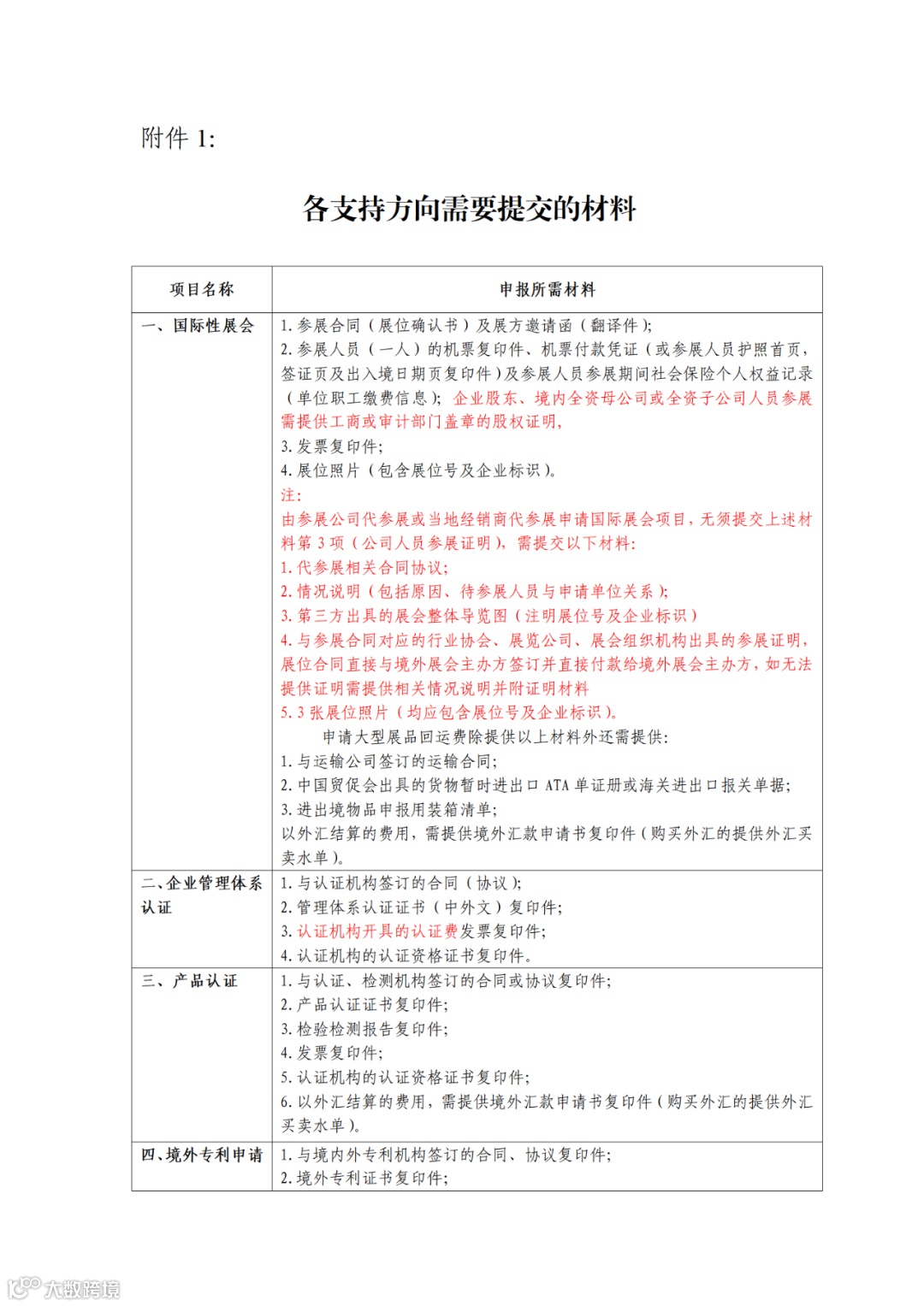 支持方向包括:国际性展会、管理体系认证、产品认证、境外专利申请、商标注册、国际市场宣传推介、外贸软件云服务等信息化建设、改善融资服务、线上国际展会、经授权使用‘三同’(‘同线、同标、同质’)产品标识等10类项目。各类企业可申报项目详见企业支持方向表。